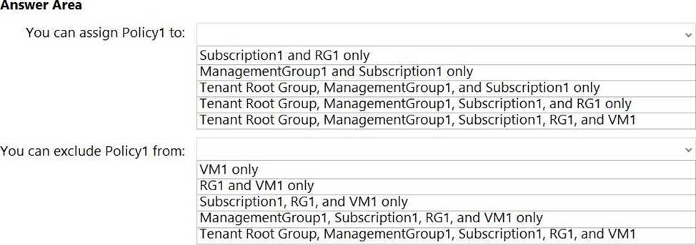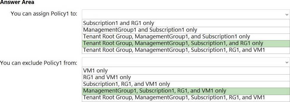 HOTSPOT You have an Azure subscription that contains the hierarchy shown in the following exhibit. You create an Azure Policy definition named Policy1. To which Azure resources can you assign Policy and which Azure resources can you specify as exclusions from Policy1? To answer, select the appropriate options in the answer NOTE Each correct selection is worth one point.