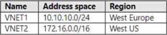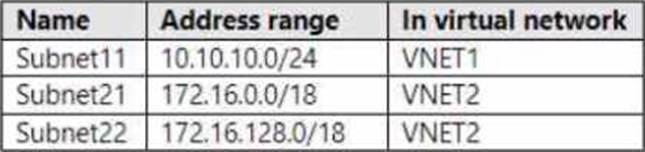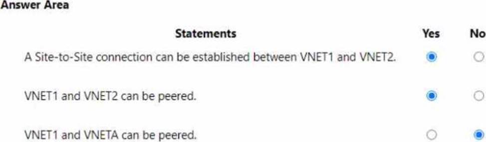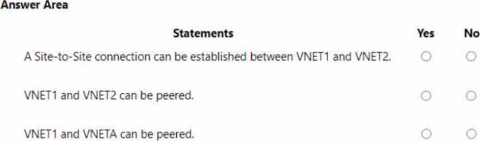 HOTSPOT You manage two Azure subscriptions named Subscription 1 and Subscription2. Subscription! has following virtual networks: The virtual networks contain the following subnets: Subscnption2 contains the following virtual network: - Name: VNETA • Address space: 10.10.128.0/17 • Region: Canada Central VNETA contains the following subnets: For each of the following statements, select Yes if the statement is true. Otherwise, select No. NOTE: Each correct selection is worth one point.