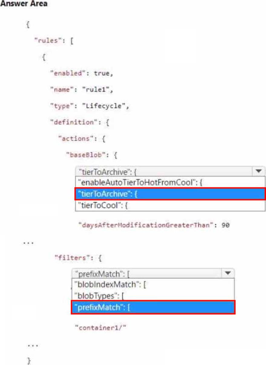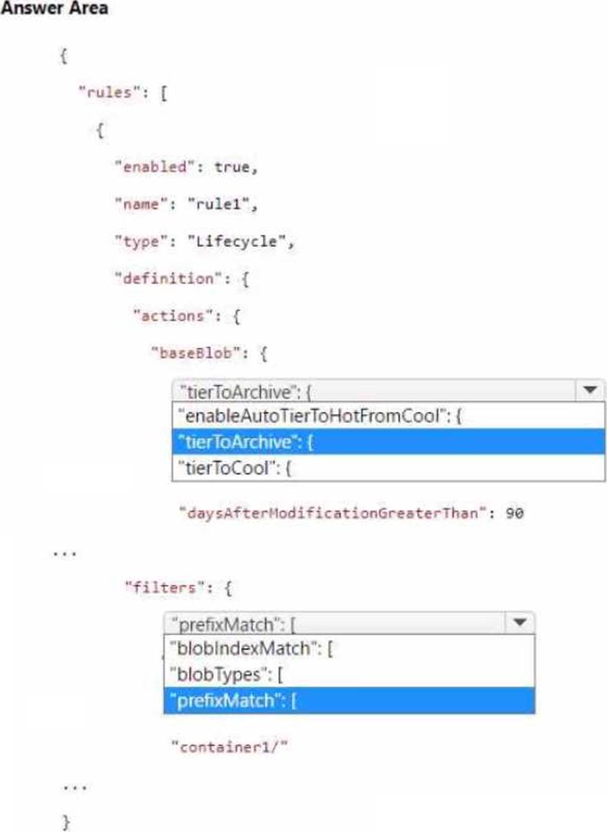 HOTSPOT You have an Azure subscription that contains a storage account named storage 1. The storage1 account contains a container named container1. You need to create a lifecycle management rule for storage1 that will automatically move the blobs in contained to the lowest-cost tier after 90 days. How should you complete the rule? To answer, select the appropriate options in the answer area. NOTE Each correct selection is worth one point.