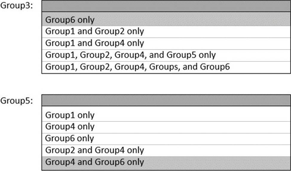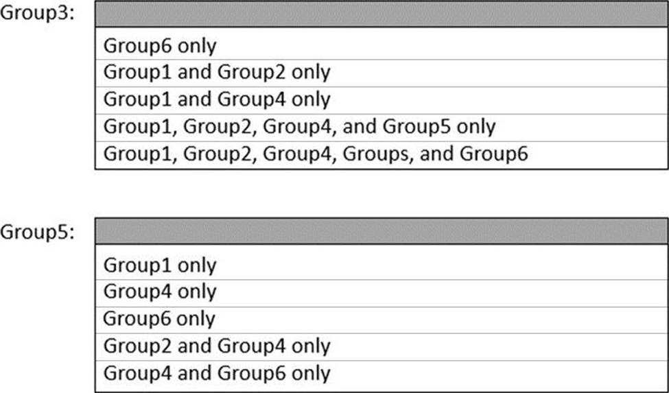 Group5 is a Global distribution group in canada.contoso.com. A Global group can only contain accounts or Global groups from the same domain. From the list, only Group4 (Global distribution, canada.contoso.com) fits. It cannot contain Group1 (Universal), Group2 (Global but different domain), or Group6 (Domain Local). Therefore: Group4 only.