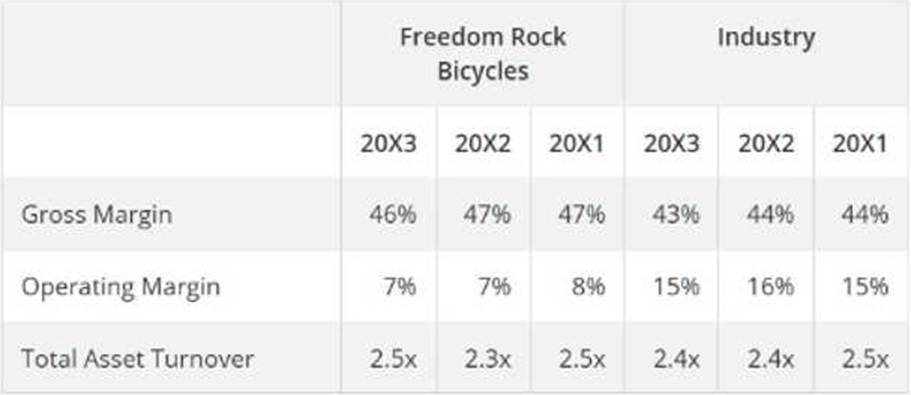 The data show that Freedom Rock Bicycles has gross margins comparable to or slightly above the industry but significantly lower operating margins. This indicates that the problem is not production efficiency or cost of goods sold, but rather operating expenses such as selling, general, and administrative costs or fixed overhead. Additionally, asset turnover is roughly in line with industry averages, suggesting that asset utilization is not the primary issue. From a financial management perspective, when gross margin is healthy but operating margin lags, the logical focus is on controlling non-production costs and evaluating fixed cost structures. Reducing unnecessary overhead, improving operating efficiency, or restructuring fixed expenses can directly improve operating margin and overall profitability.