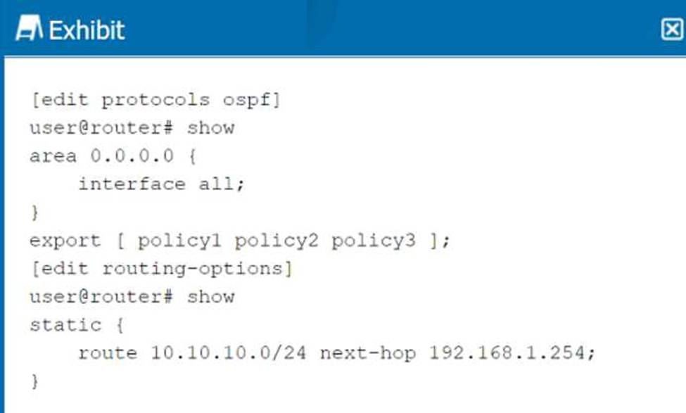 Referring to the exhibit, OSPF has three export policies that match different static route prefixes. The 10.10.10.0/24 static route does not match any terms in the policy1 routing policy.
