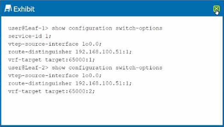 E. Configure the set switch-options service-id 1 parameter on Leaf-2: This ensures that both Leaf-1 and Leaf-2 use the same service ID, which is necessary for consistency in the EVPN-VXLAN setup. Data Center