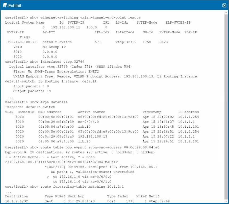 Service-ID: Leaf-1 has service-id 1 configured, while Leaf-2 does not have this parameter. For consistency and proper operation, the service-id should be the same across both leaf devices. VRF Target: Leaf-1 is configured with vrf-target target:65000:1, while Leaf-2 is configured with vrf-target target:65000:2. To allow proper VRF import/export between the two leafs, these should match.