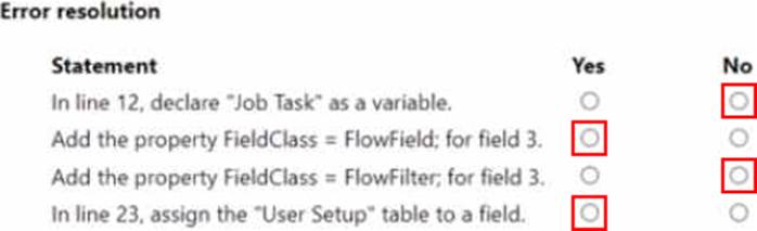 For "In line 12, declare 'Job Task' as a variable": In the AL code provided, the "Job Task" appears to be part of a CalcFormula of a FlowField, which means it references a table and not a variable. The "Job Task" does not need to be declared as a variable because it is used to reference a table in a CalcFormula expression.