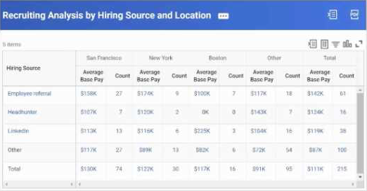 Therefore, to show the percentage of hires per recruiter relative to the grand total across recruiters and regions, you would select “Percent of Overall Total” on the Number of Hires summarization.